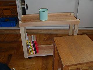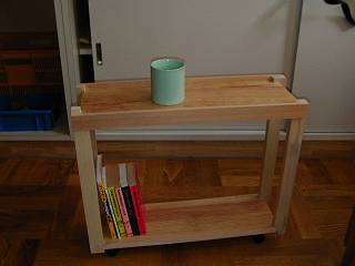 足は,のこぎり引きの練習をした後,天板を挟む相がき(片がき)の部分だけ,機械加工にしようと思っている。まく板となる部分は,外側からのうちつけで,縁を上に出して手すりのようにするか,面をあわせて大きなものを置けるようにするか。また,天板と足の接合部もいくつかバリエーションを選べるようにしてみた。足にはキャスターをつけて完成。自分の机の横に置いて使っている。