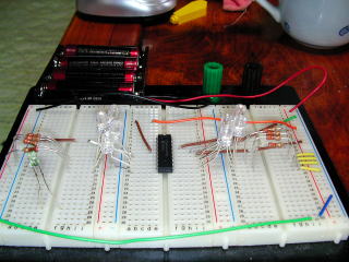 今回は、サンプルプログラムを使ってみたが、ちょうどこれから製作しようと考えているLED8本を制御するものだった。ブレッドボードを使って組み立てて、PICを差し込む。電源は単三電池4本で6V。