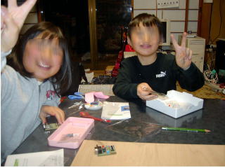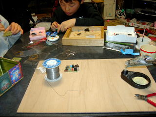 とりあえず、一人2つ分を持たせて、箱を2つずつに分けて部品をあけ、部品の足を曲げて基盤に差し込んだところで私がハンダ付けをして返すという段取り。1つをハンダ付けしている間にもう一つの部品を挿すという寸法だけれど、やはりなかなかむずかしいらしい。