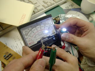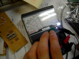 公開授業を行った日、夜箕輪中によってそんな話をしたら、T先生が早速回路を組んでくれたので、テスターにつないでもらって色々換えて試してみた。