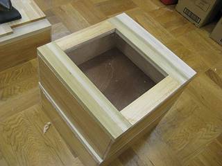 ふたの部分の製作。アクリル板(3mm厚)を購入してきて、周りの板に溝を切ってはめ込んだ。 先に枠を決めてから、その大きさに合わせてアクリル板を切ったので、ばっちり決まった。 ちなみに1つ分のアクリル板は1200円程度になる。 それを先日作った枠に接着し、箱にした。 今度はこれを丸鋸で切ってふたと本体に分離する予定。