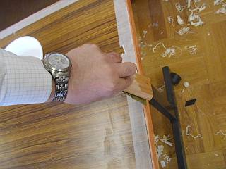 貼り付けた板をカンナで削る。しかし、節の部分があったり、隙間が空いていたりして張り替えなければいけないところも多かった。