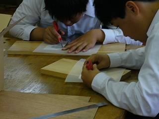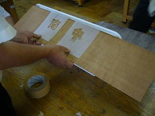 それを一年生がプラスチック板にカッターで抜く。
