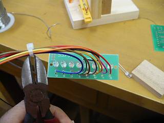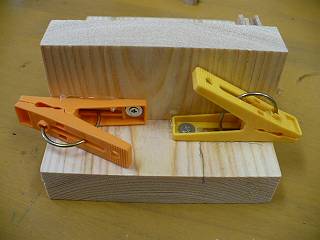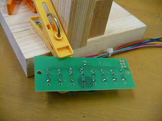 その後、もう片方もハンダ付けしてからコードを差し込んでハンダ付け。ここで水平方向の洗濯ばさみを使う。