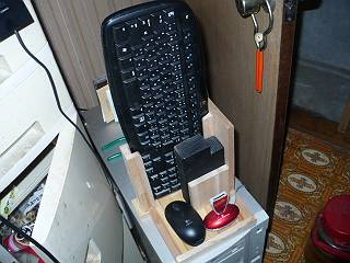 おまけ1。無線のキーボードとマウスを収納するのと、ディスプレイの足を収納するガイドを作った。