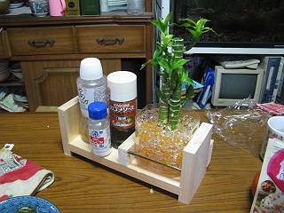 土をのぞいてよく洗って、植え付け?てみる。ここでは食卓用テーブルフラワーという前提で調味料などを載せてみた。