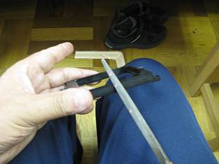 クーラーの留め具を加工。まずは薄い状態でも挟めるように、表面を削って平らに。