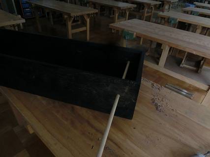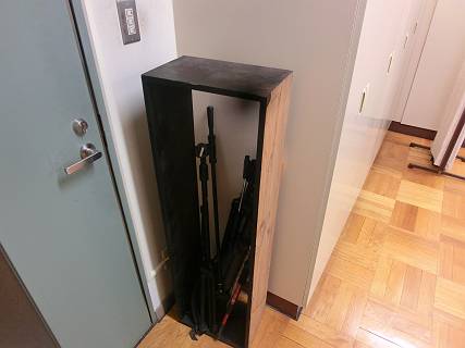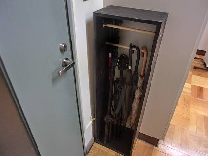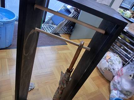 技術準備室の入り口に、傘などを置いている場所があるのだけれど、つるすようにはなっていないので落ち着かない。