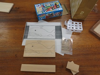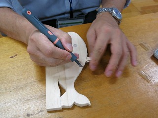彫刻刀も美術科からお借りして掘り進める。周りは糸鋸で切断した。横着して4枚重ねて切ったので,ノコ刃のぶれによって形が変わってしまった。