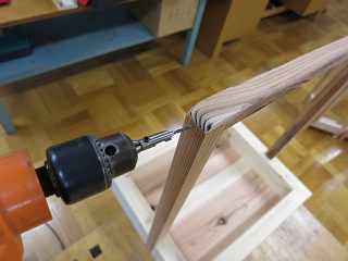 上下の枠を,相欠きした柱で接続する。周りの板はそれほど力もかからないので合板を溝に差し込む。