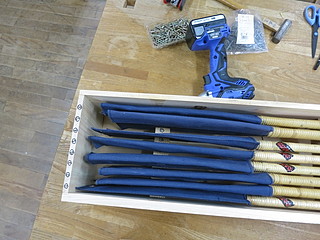 キリの収納箱は既存の木箱に支えの溝付き棒を並べて終了。