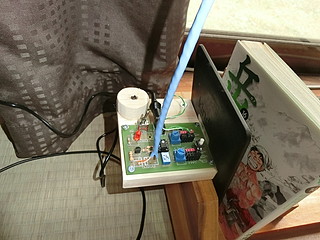 こんな感じで奥に地震センサー、手前にはタクトスイッチをつけた。OR回路を選択して、センサーかタクトスイッチオンで点灯。