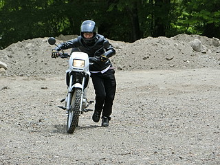 このバイクはキックスターターが省略されているので、押しがけをするしかなくなってしまった。そこからスタート。