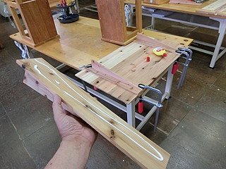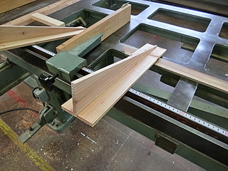 同じ板で脚を作る。溝を入れたところへ斜めに切った板を差し込んでボンドで固定。