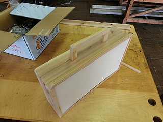 残っていたスギ板で箱を作る。今回は電源ケーブルとリモコンも入れることができるように内部を3つのブロックに分けた。