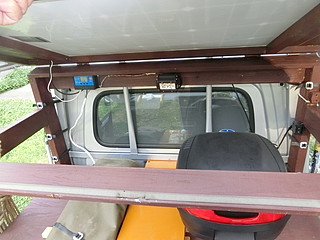 ウインチフックの固定も兼ねて、2段目の棚(大型ボックスを押さえつける)と太陽パネルの屋根にテンションをかけて固定している。