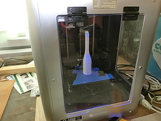 220°に加熱して溶かしたプラスチックで出力していくのでサポート部材が必要になるけれど、これは本体附属のスライサーソフトが自動でやってくれる。