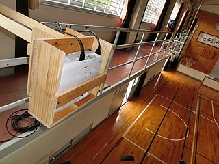 プロジェクタは普通のものなので、体育館のギャラリーからでないと大きさとピントのバランスが取れなかった。