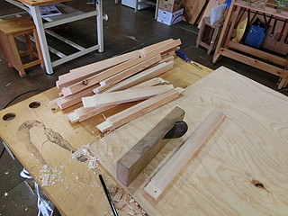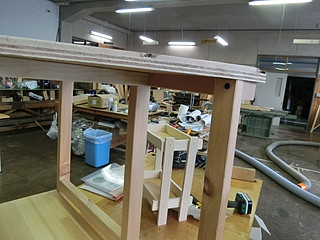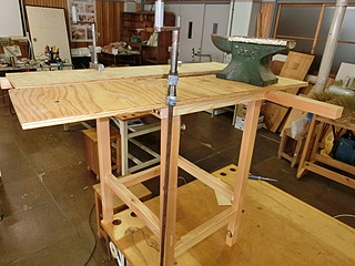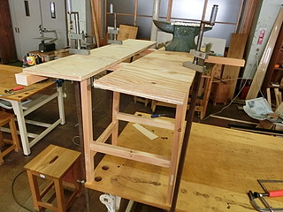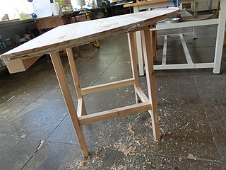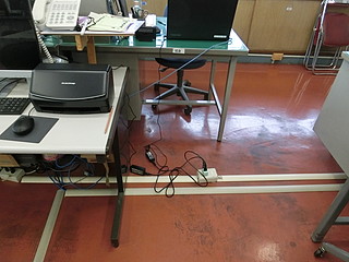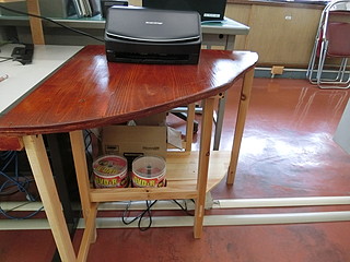 職員室の机配置を変更して以来、以前の設計で取り付けたコンセントボックスが邪魔でつい毛手しまう状態だった。残り材でテーブルを作ることにした。