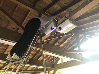 古いプロジェクターでVGA入力しかないので、HDMI→VGAの変換器を取り付けて7mのHDMIケーブルによって接続する。