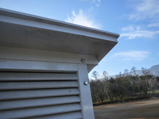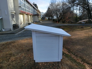 永年使ってきた百葉箱、落ち葉や雪が積もって屋根に大穴が空いてしまいました。 今までは板を並べた屋根でしたが、型枠合板で製作。さすがに一カ所だけ継ぎました。 耐候性塗料を塗って、取り付け。塗料は定期的に更新してメインテナンスしていかなければなりません。