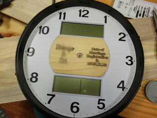 土日の学校で少し作業を行った記録 この時期に、本校の先生が立て続けに入籍をされた。めでたいので時計に入籍日をレーザー彫刻して贈ることにした。 文字盤は白だったので、木を薄く削ってレーザー加工機で作業した。 校長室のテレビ前にいろんな贈り物がたまってきたので、テレビの上に台を付けることにした。 元々、3Dプリンタで作った固定用のアームがあるので、その上に載せるだけにして、板を加工。 下がすっきりした分、全体の見ためは賑やかになった。